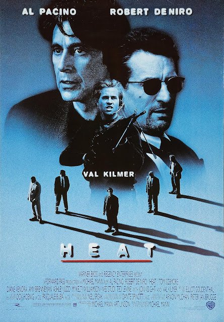 Hunters and their prey–Neil and his professional criminal crew hunt to score big money targets (banks, vaults, armored cars) and are, in turn, hunted by Lt. Vincent Hanna and his team of cops in the Robbery/Homicide police division. A botched job puts Hanna onto their trail while they regroup and try to put together one last big ‘retirement’ score. Neil and Vincent are similar in many ways, including their troubled personal lives. At a crucial moment in his life, Neil disobeys the dictum taught to him long ago by his criminal mentor–‘Never have anything in your life that you can’t walk out on in thirty seconds flat, if you spot the heat coming around the corner’–as he falls in love. Thus the stage is set for the suspenseful ending….